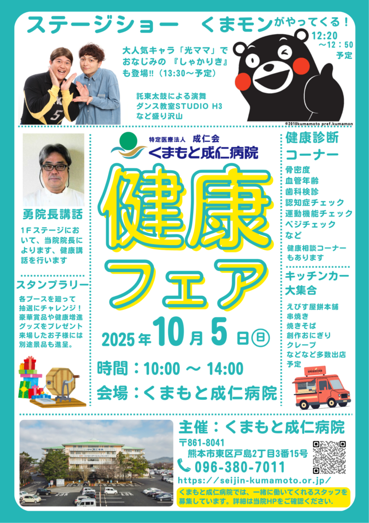 テーマはずばり“健康”。健康診断コーナーや勇院長によるわかりやすく楽しい健康講話に加え、大人気『しゃかりき』のステージショー、迫力の託東太鼓、元気いっぱいのダンスステージなど、見どころが盛りだくさん!そして、くまモンもやってきます!会場にはバラエティ豊かなキッチンカーも登場し、美味しいグルメも楽しめます。